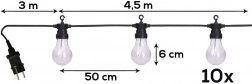 - 10 LED-pærer med diameter ca. 6 cm, afstand mellem pærerne ca. 50 cm.