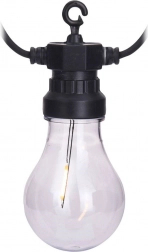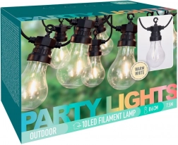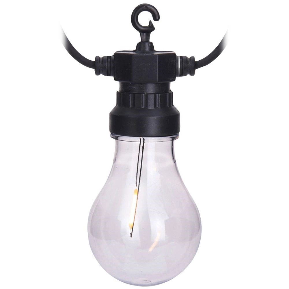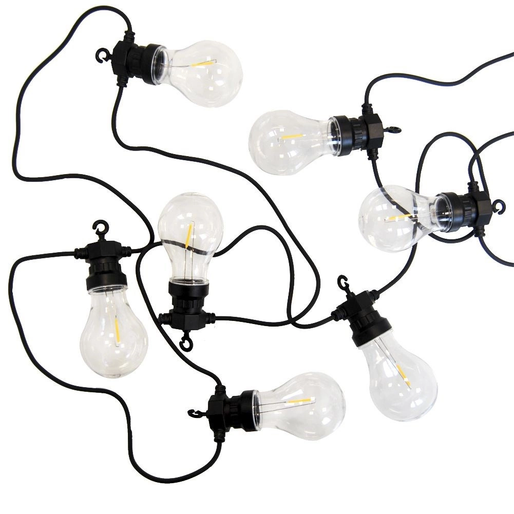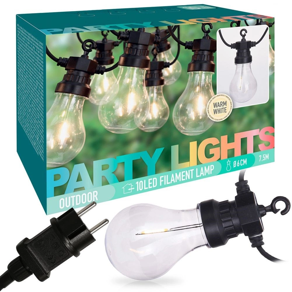 Stilfuld have-LED-lyskæde på 7,5 m med 10 gennemsigtige LED-pærer, der skaber en hyggelig atmosfære på terrasse, altan og indendørs. Takket være IP44-klassificering er den velegnet til udendørs brug, har varmt hvidt lys, energibesparende drift og nem ophængning med integrerede kroge.