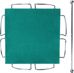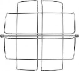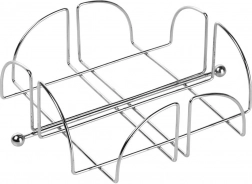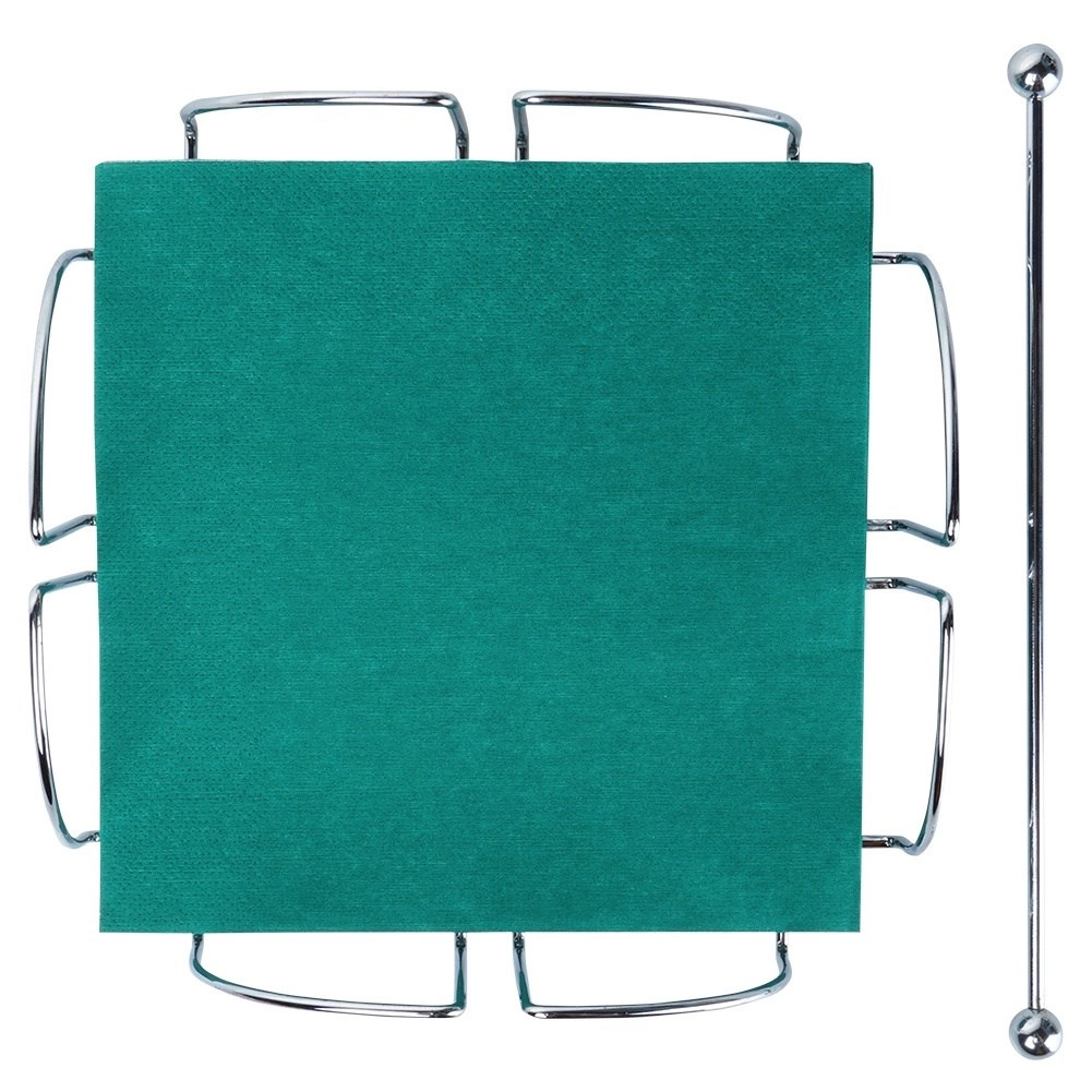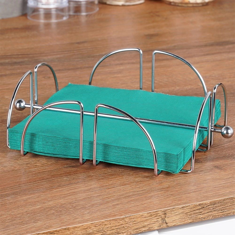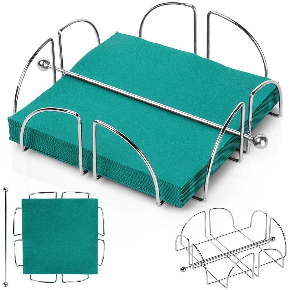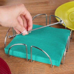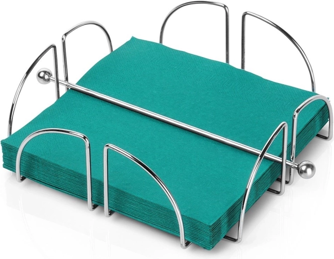 Praktisk og stilfuld servietholder til daglig brug. Forkromet stål i sølvfinish er let at rengøre og modstår almindeligt slid. Den åbne konstruktion muliggør hurtig genopfyldning og bekvem aftrækning af servietter, mens trykstangen holder dem pænt på plads.