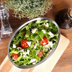 Elegant oval bakke af kvalitets rustfrit stål med målene 25,5 × 18 × 4 cm er ideel til servering af retter, forretter og snacks. Takket være det robuste materiale er den ubrudelig, hygiejnisk og nem at rengøre, hvilket værdsættes både i hjemmet og i professionel gastronomi. Alsidig anvendelse i køkkenet, til havefester og på farten.