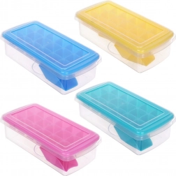 Det praktiske låg forhindrer spild under transport og beskytter isen mod lugte fra fryseren. Sættet indeholder også en skovl til ren og bekvem opskubning. Formen kan også bruges til frysning af juice, sorbeter eller urter. Farven leveres tilfældigt.