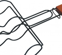 Den todelte kurv med lås klemmer pølser eller spyd sikkert fast, så intet falder ud ved vending, og tilberedningen bliver jævn.