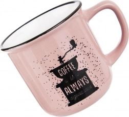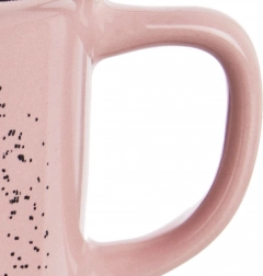 Nyd din yndlingsvarme drik i en behagelig og elegant kop, der kombinerer praktisk brug med et attraktivt design. Den lyserøde keramiske krop med spættet effekt suppleres af en sort kant og et kaffemøllemotiv med tekst, så koppen passer perfekt i både moderne og rustikke køkkener.