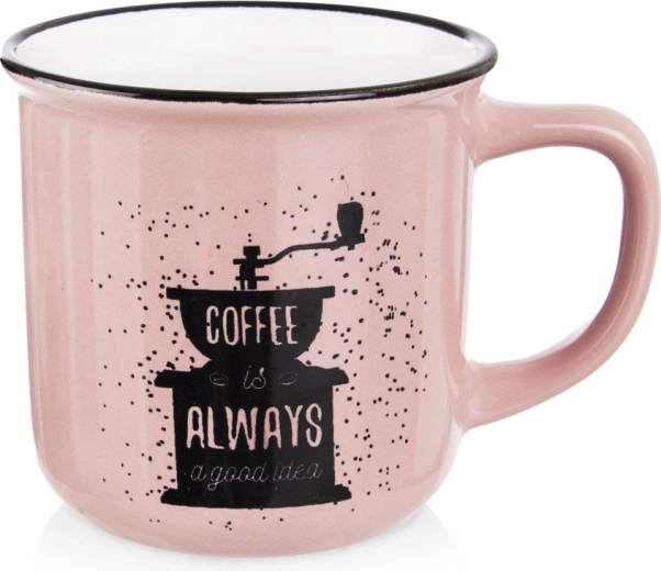 Lyserød glasur med diskret spættet effekt, sort kant og motiv af en kaffemølle med teksten “Coffee is always a good idea” giver dit køkken en personlig charme.