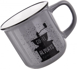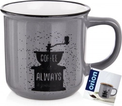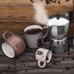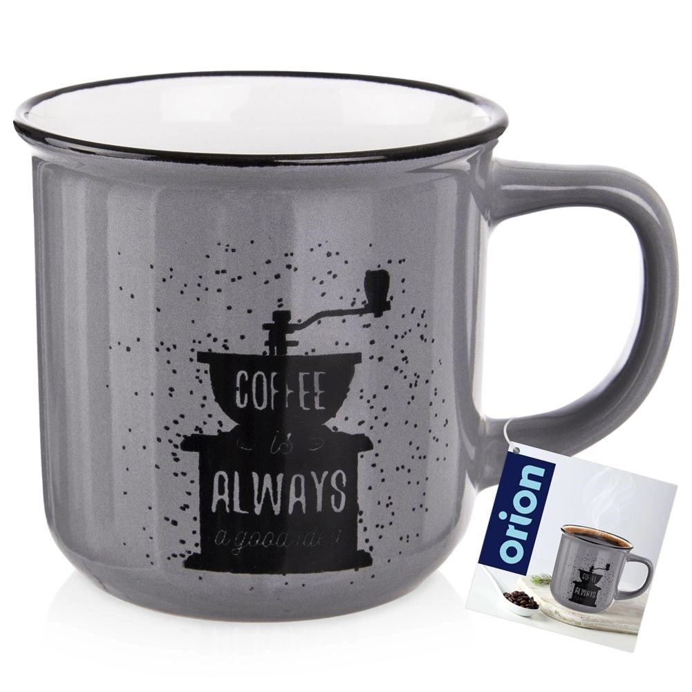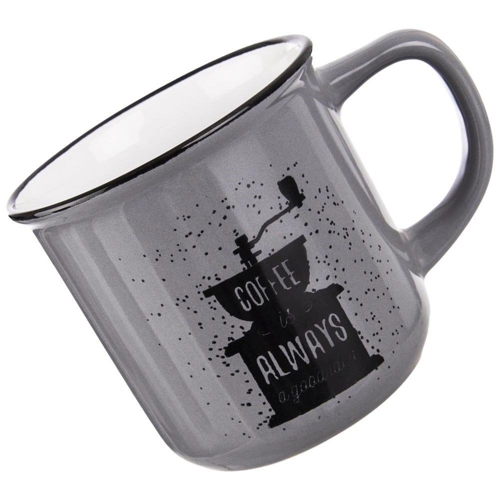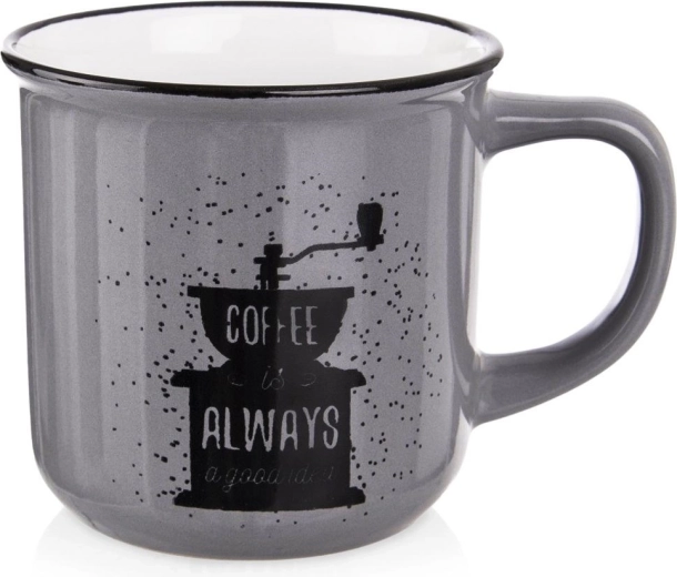 Den elegante grå overflade suppleres af sort print af en håndkværn og tekst – kruset glæder enhver kaffeelsker og pynter i både køkken og kontor.