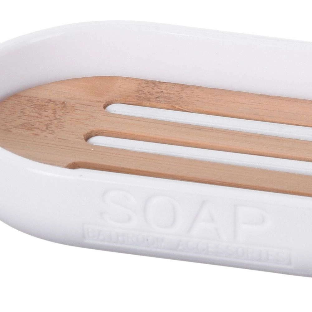 Stilfuld hvid sæbeskål med aftagelig bambusindsats, der kombinerer moderne udseende og funktionalitet. Tre drænhuller og gennemtænkte forhøjede kanter sikrer luftcirkulation, hurtig tørring og et rent område omkring vask eller køkkenvask. Overfladen med den diskrete tekst “SOAP” virker elegant og er let at rengøre.