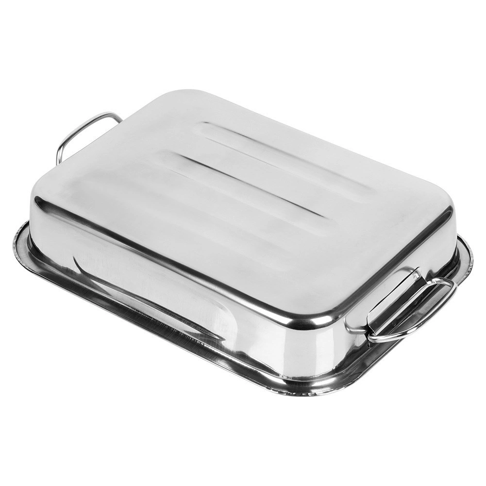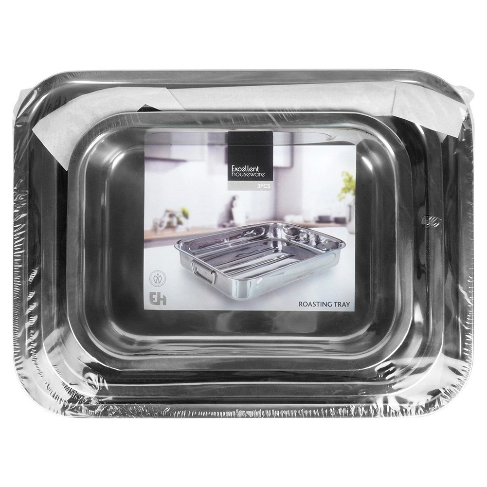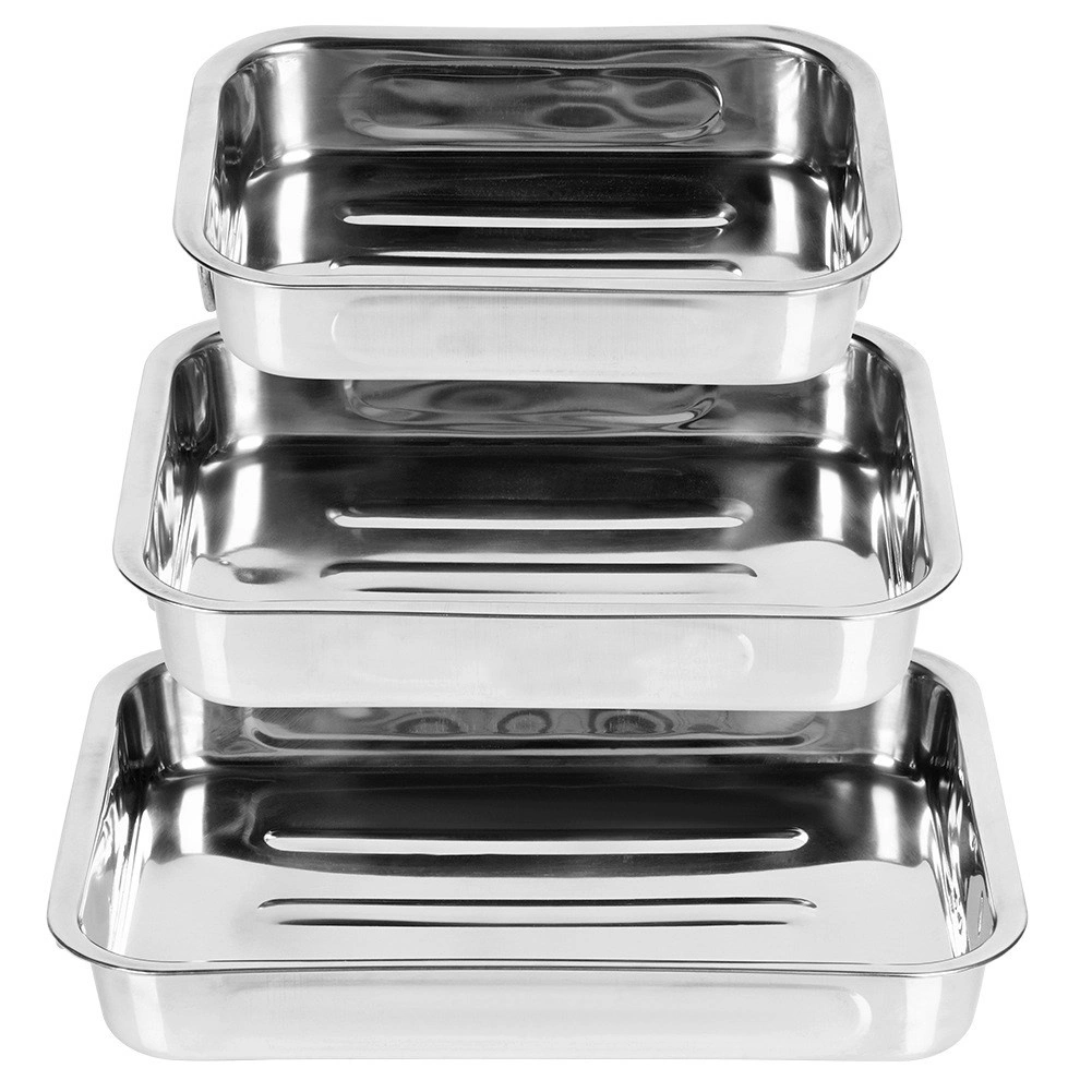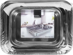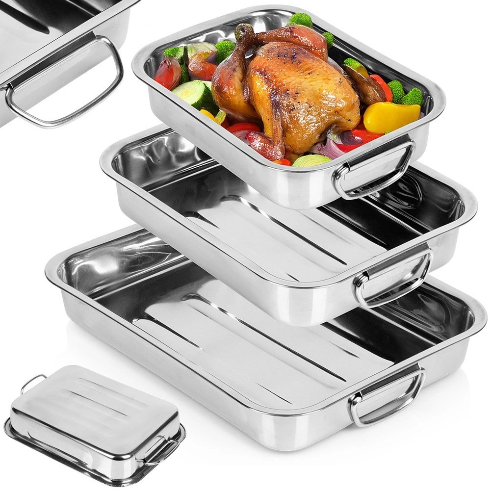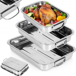 Et sæt med tre robuste bradepander i poleret rustfrit stål, som giver alsidig anvendelse til stegning af kød, grøntsager, desserter og ovnretter. Takket være den glatte overflade er de nemme at rengøre og har lang levetid. Integrerede, foldbare håndtag gør det nemt at sætte i og tage ud af ovnen.