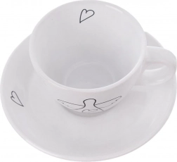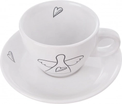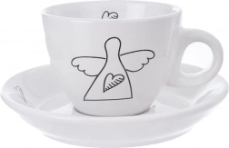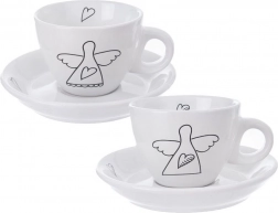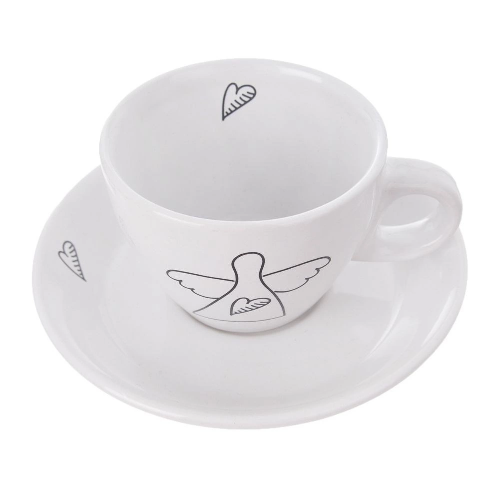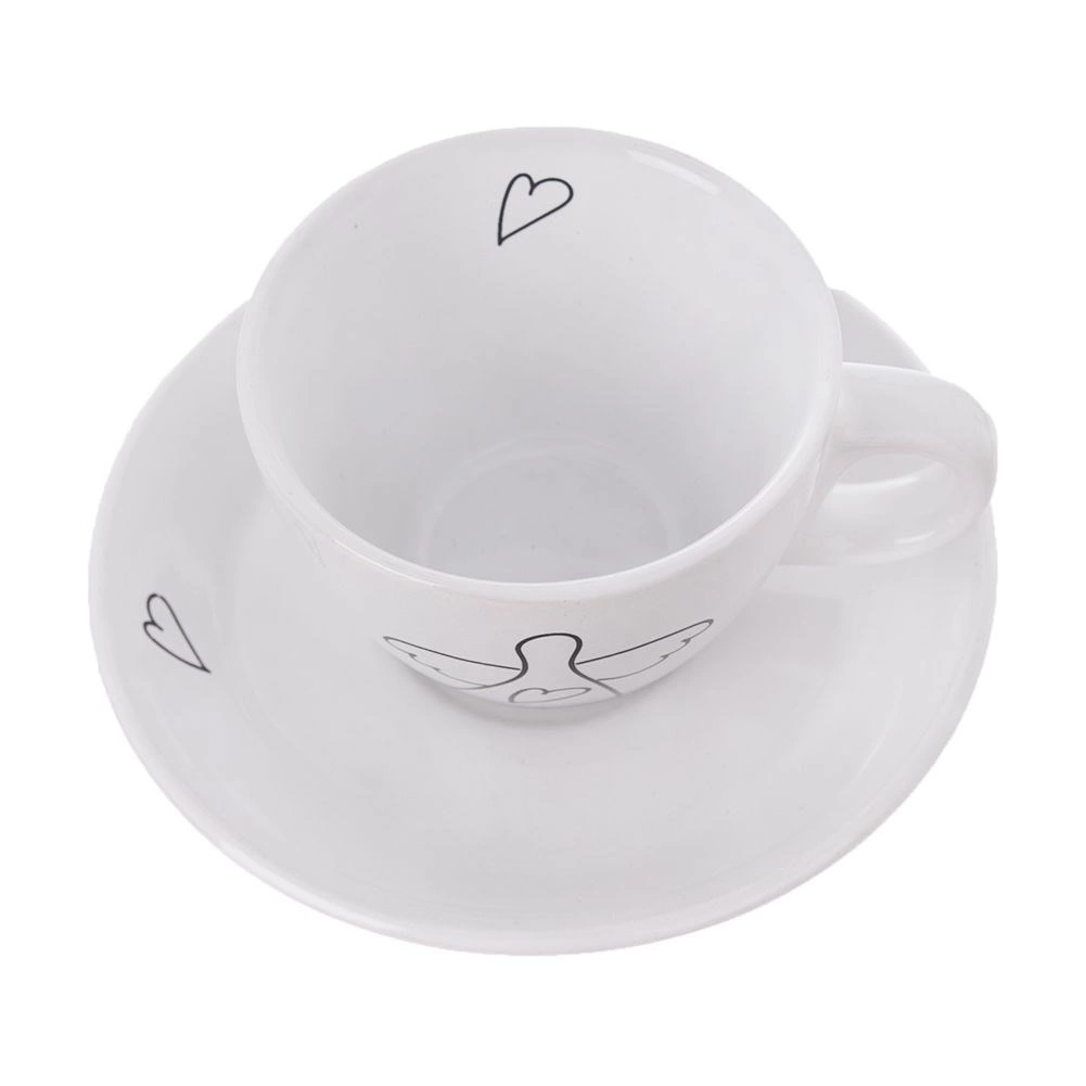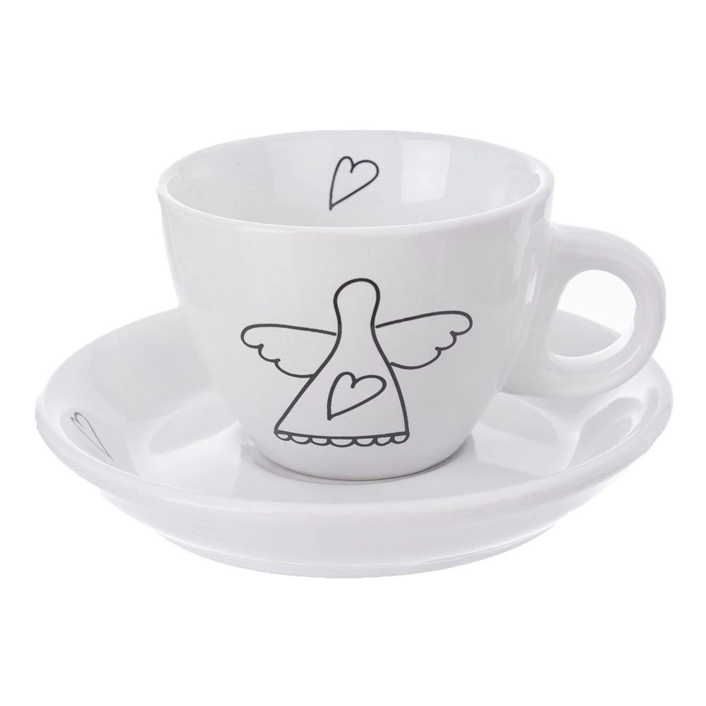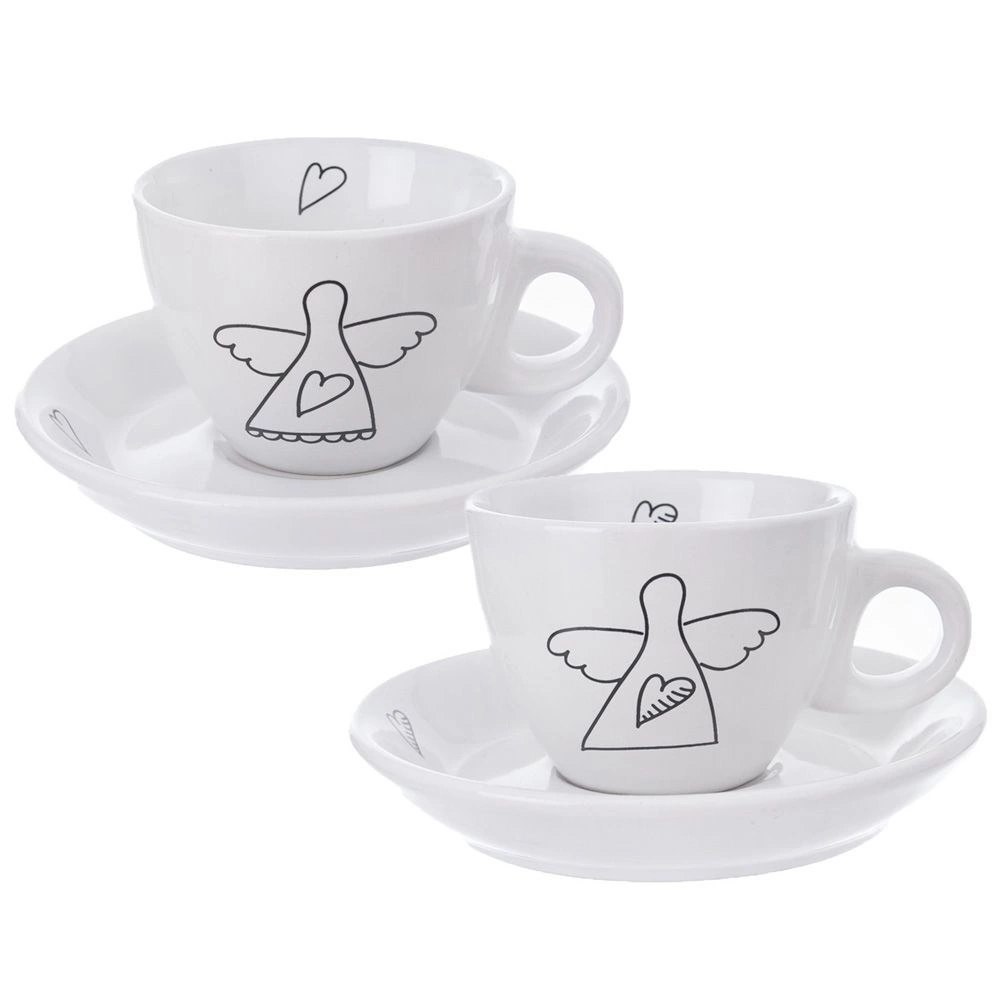 Oplev stilfulde og praktiske espressokopper, der forskønner ethvert bord. Det minimalistiske hvide design med sort lineart af en engel og et hjerte giver din kafferutine en diskret elegance. Hver kop har et ergonomisk hank, og underkoppen opfanger dråber og kan holde en ske eller en lille dessert.