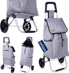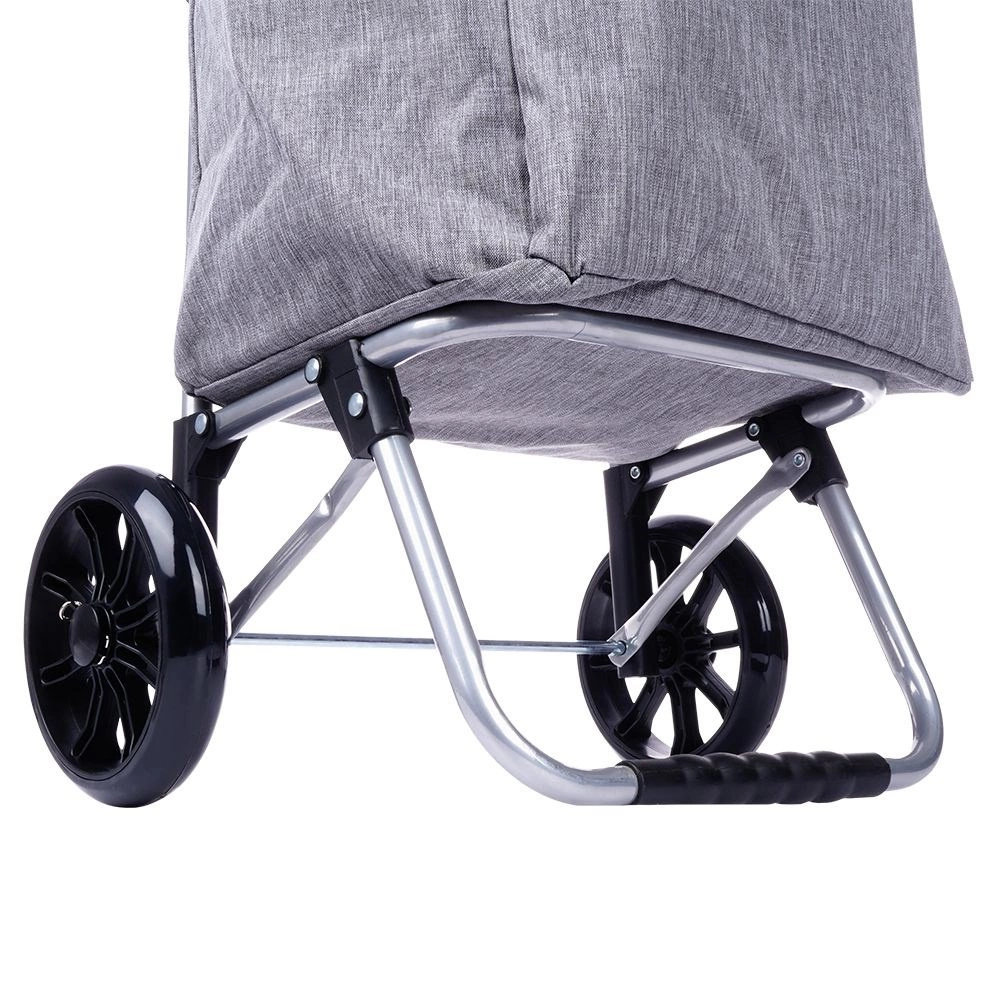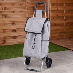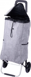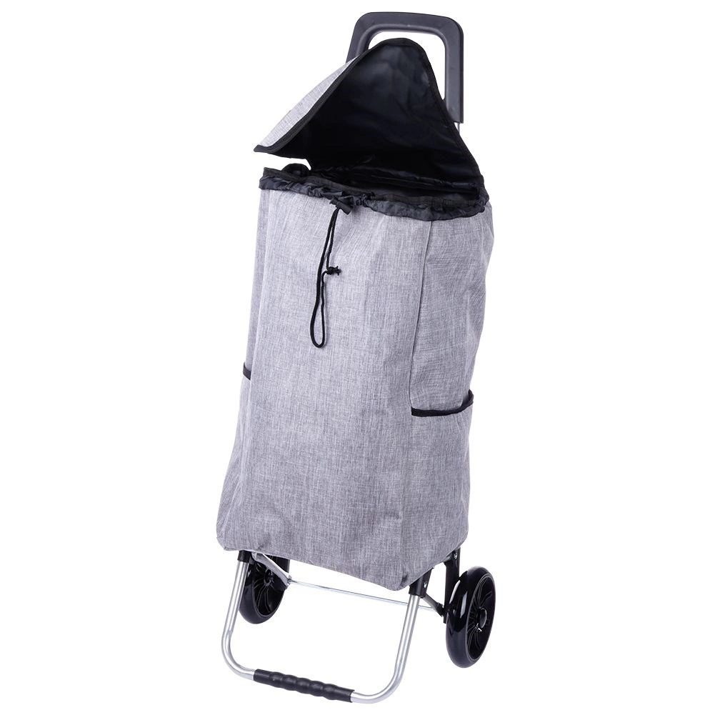 Indkøbsvognen med grå stoftaske er designet til komfortabel og sikker transport af indkøb. Den lette, men robuste metalramme med to store plasthjul giver stabilitet og en glidende kørsel. Tasken beskyttes af en klap og lukkes med en snøre, så indholdet forbliver sikkert selv i dårligere vejr.
