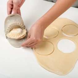Med denne pirogform forbereder du hurtigt og uden rod perfekt formede og tæt lukkede dejpakker med din yndlingsfyldning – kød, grøntsager eller ost. Rul dejen ud, udstik cirkler, læg dem på formen, tilsæt fyld og tryk de to dele sammen for at lave en jævn kant.