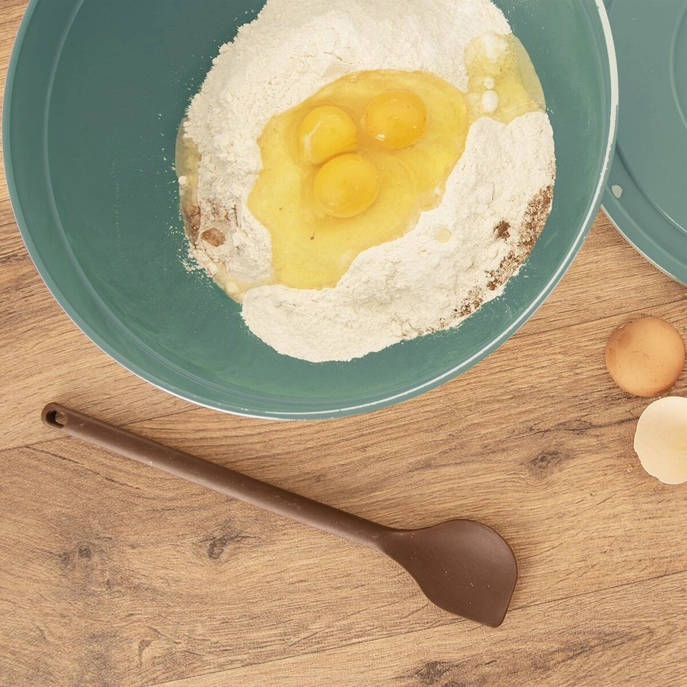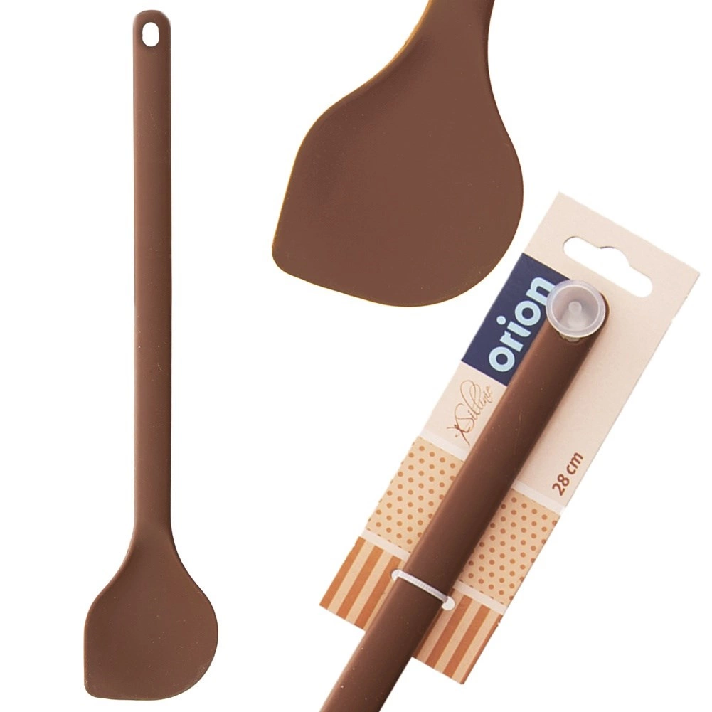 Denne brune silikone køkkenspatel er en pålidelig hjælper til omrøring, udsmøring, vending og servering. Kvalitetssilikone med indvendig metalforstærkning sikrer den ideelle kombination af stabilitet og elasticitet, så du nemt når ind i skåle og pander uden at ridse overfladen.