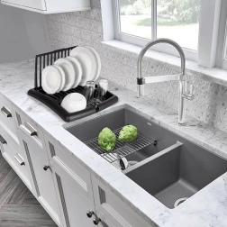 Den integrerede tud leder overskydende vand fra dryppefladen ned i vasken, så bordpladen forbliver tør og ren.