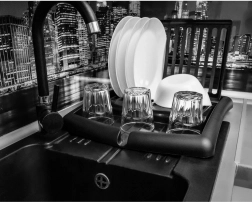 Det praktiske opvaskestativ er en uundværlig hjælper i ethvert køkken. Takket være den smarte inddeling tilbyder det dedikeret plads til 11 tallerkener, område til krus og glas samt et integreret afløb, der sikkert leder vandet i vasken og dermed beskytter køkkenbordet mod fugt.