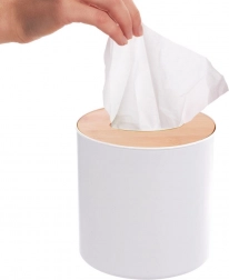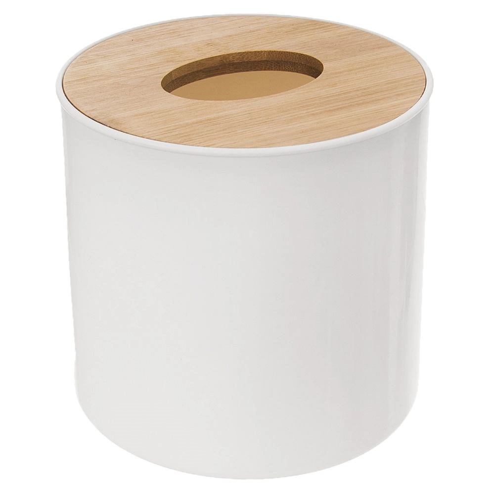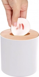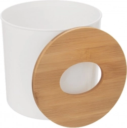Denne lille, men praktiske affaldsspand er perfekt til dagligt småaffald. Den kombinerer en hvid plastkrop med et bambuslåg med central åbning for hurtig og hygiejnisk bortskaffelse. Takket være de kompakte mål passer den på en hylde, vindueskarm eller bordplade.