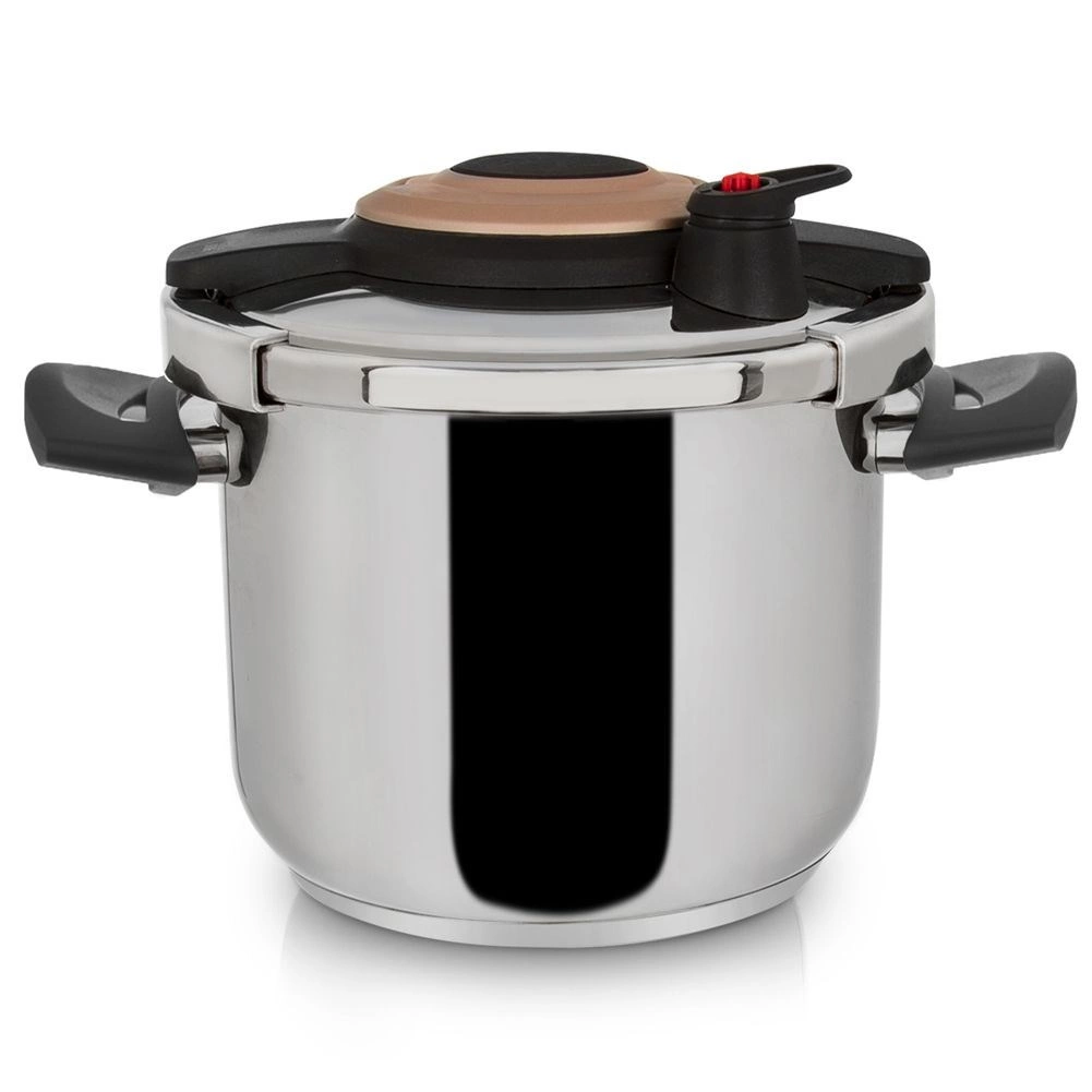 Den flerlagede akutermiske bund akkumulerer og fordeler varmen jævnt, hvilket sparer både energi og tid. Til rådighed er 3-trins regulering af dampudslip for præcis trykkontrol. Kompatibel med alle typer kogeplader: gas, elektrisk, glaskeramisk, halogen og induktion.