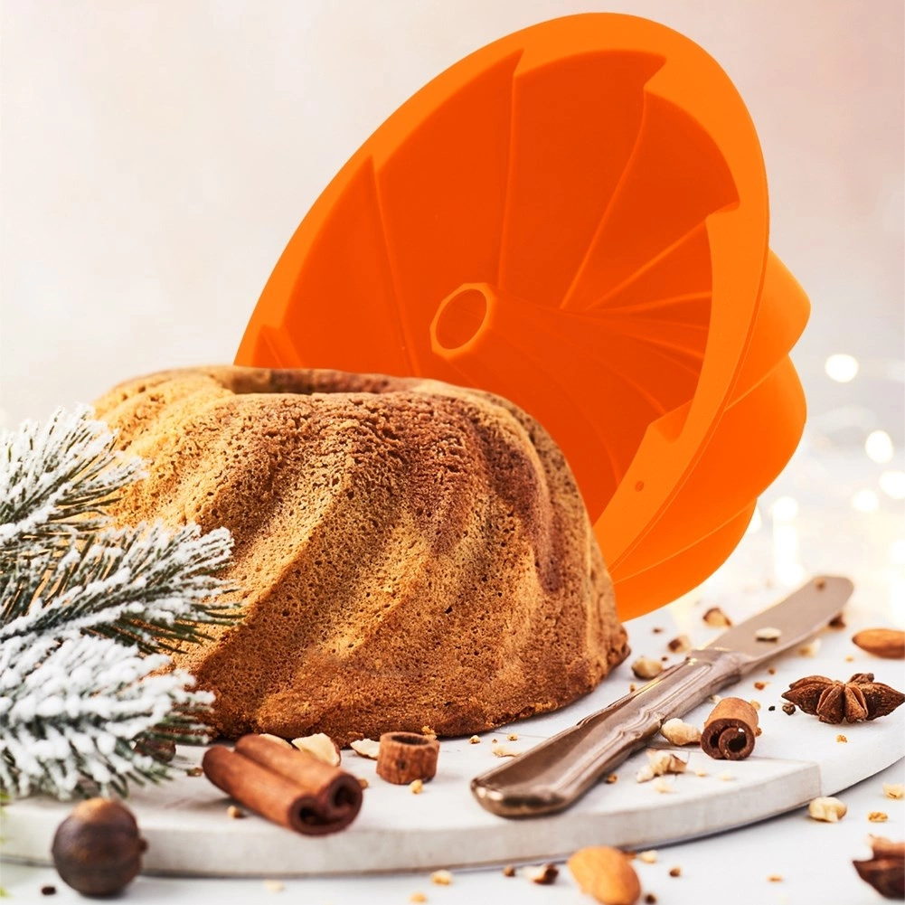 Spiral‑blomsterrelief og midterskorsten for jævn gennembagning og et dekorativt udseende på hver bundt‑kage.