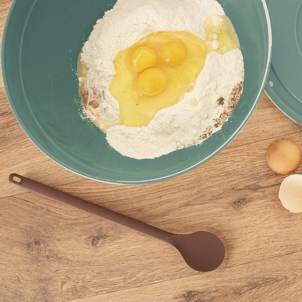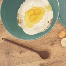 Det éndelte design er let at vedligeholde – silikone absorberer ikke lugte eller væsker, og produktet kan gå i opvaskemaskinen. Det praktiske skridsikre håndtag ligger godt i hånden selv ved længere omrøring, og hullet i enden gør det let at hænge på skinne.