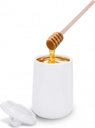 Krukken er lavet af holdbart hvidt porcelæn, skeen af naturtræ for behagelig og skånsom opskydning af honning.