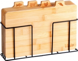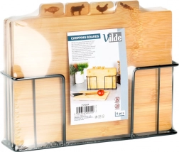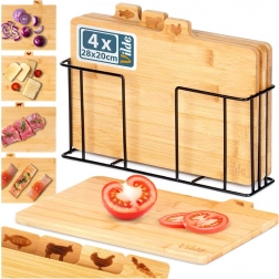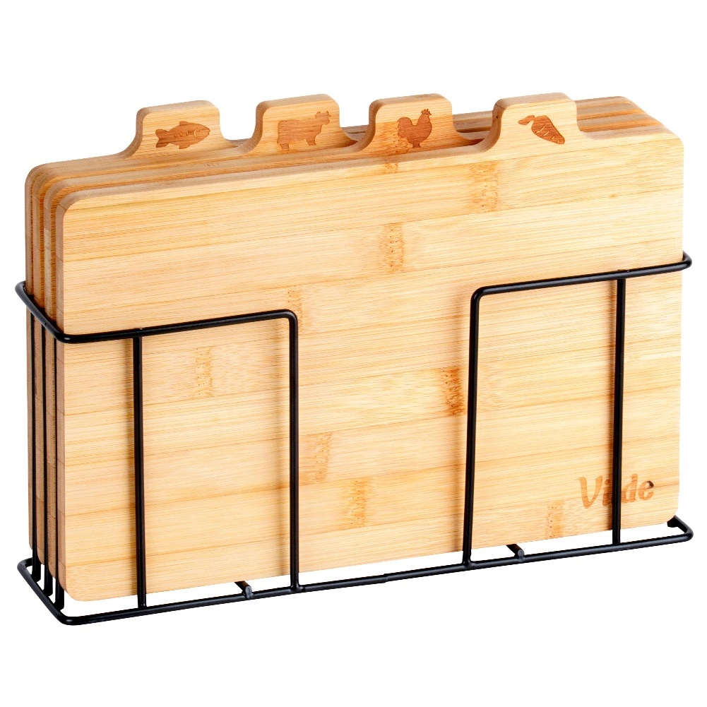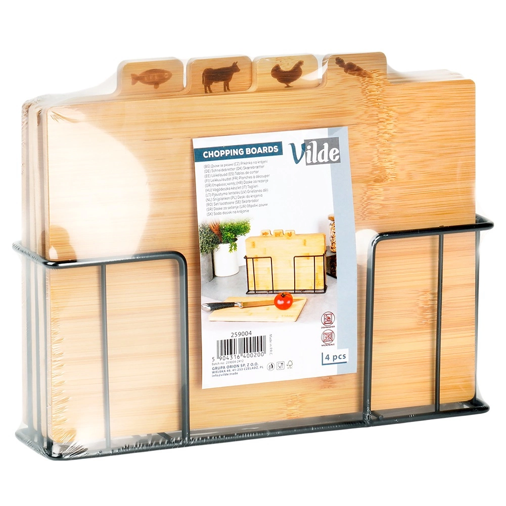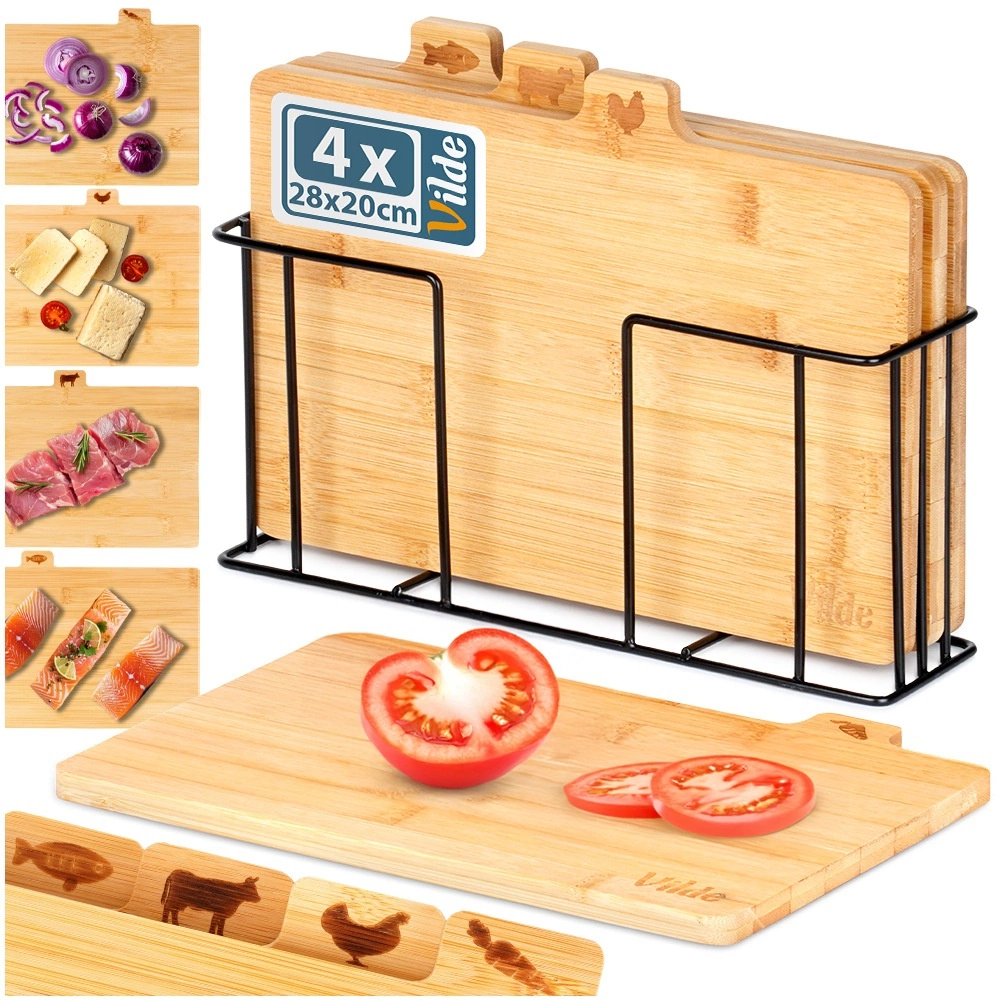 Med dette sæt bambusskærebrætter holder du køkkenet i perfekt orden. Fire separate brætter med praktiske faner og ikoner angiver tydeligt deres brug – til grøntsager, fjerkræ, kød og fisk – og understøtter dermed hygiejnisk madlavning. Det stabile metalstativ i sort sørger for, at brætterne altid er lige ved hånden og pænt opbevaret.