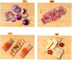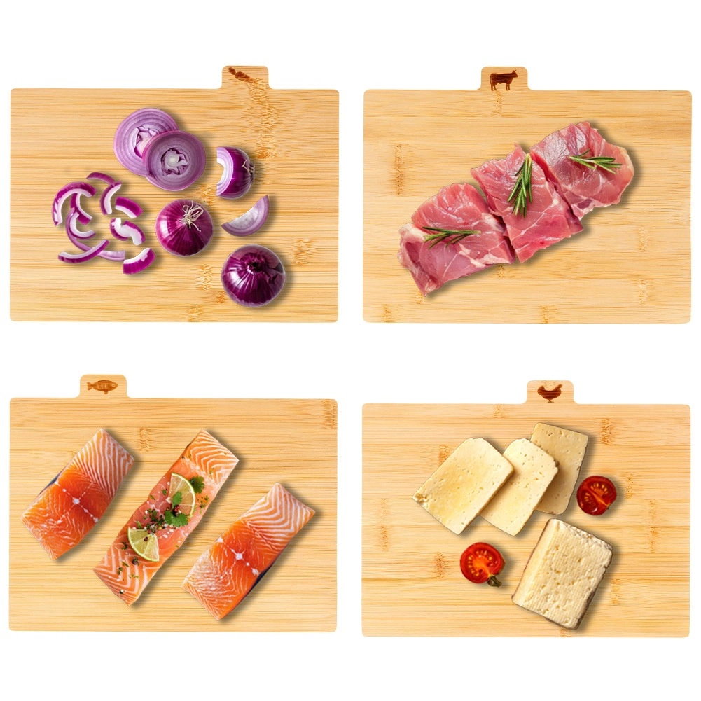 Hvert bræt har en fane med indgraveret ikon til en bestemt type fødevarer – grøntsager, fjerkræ, kød og fisk. Så undgår du nemt krydskontaminering og bevarer renheden under madlavningen.