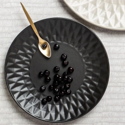 Elegant desserttallerken i moderne sort, der kombinerer et tidløst formsprog med en markant reliefkant. Kvalitetskeramik sikrer holdbarhed og bekvem daglig brug, uanset om du serverer kager, desserter, frugt eller små anretninger.