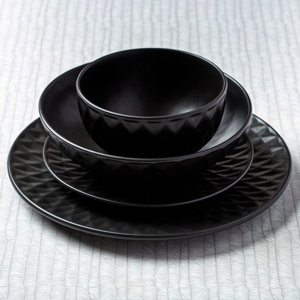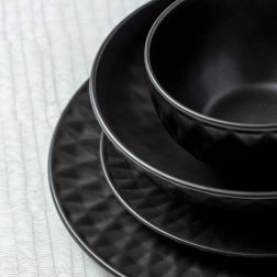 Den geometrisk strukturerede kant og den matte sorte udførelse giver dit borddækning et markant, nutidigt udtryk.