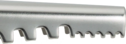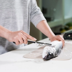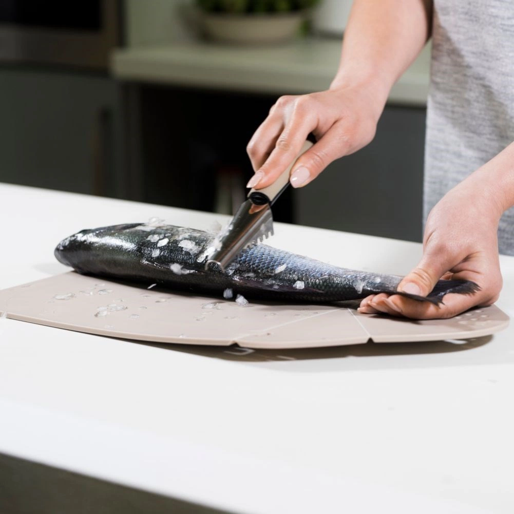 Den takkede klinge i rustfrit stål fjerner skånsomt og hurtigt skæl uden at beskadige fiskens hud.