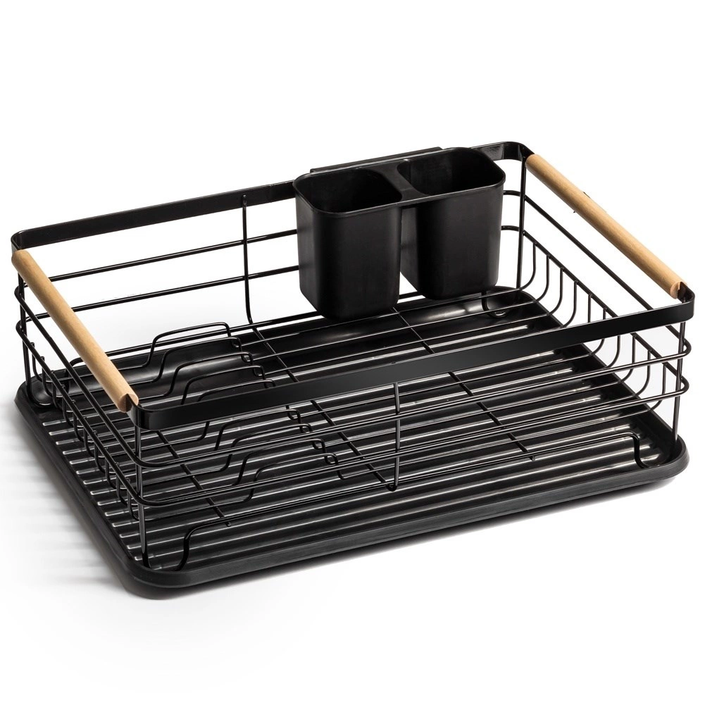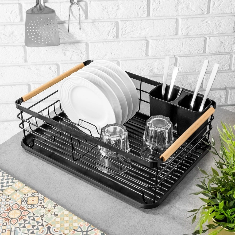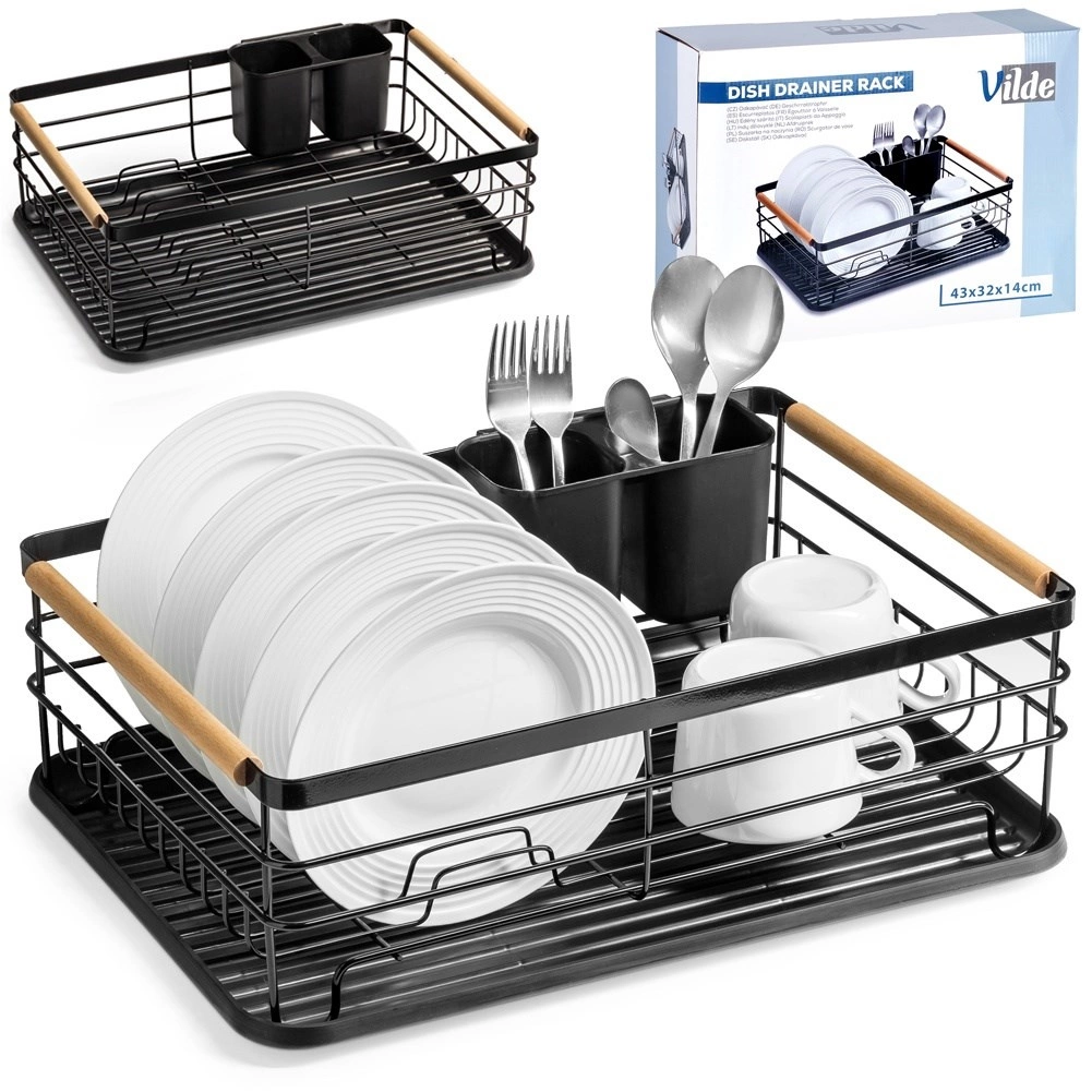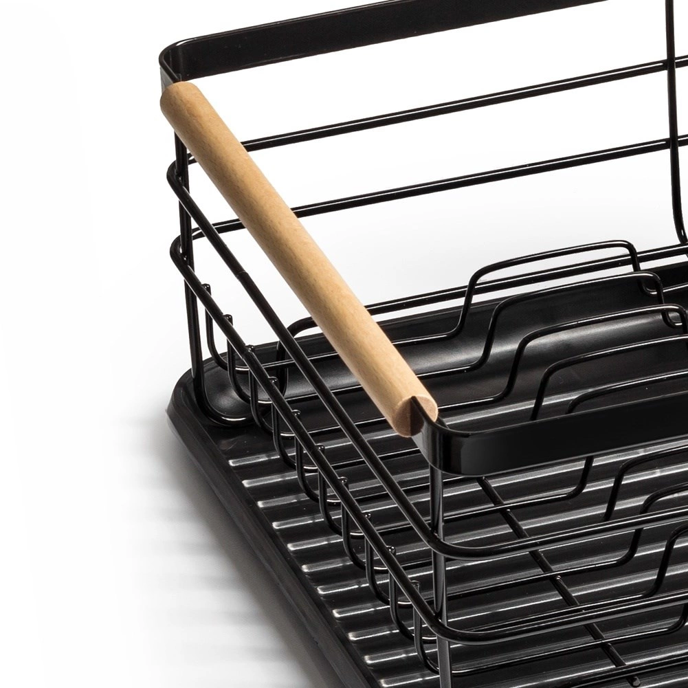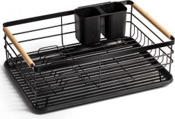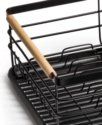 Et elegant og funktionelt opvaskestativ hjælper med at holde køkkenet rent og organiseret. Sort metaludførelse med naturlige bambushåndtag kombinerer holdbarhed med et moderne udtryk. Den aftagelige drypbakke opfanger vandet sikkert og gør rengøringen nemmere, mens den todelte bestikkurv kan placeres inde eller ude efter behov.
