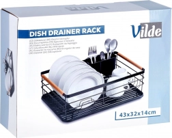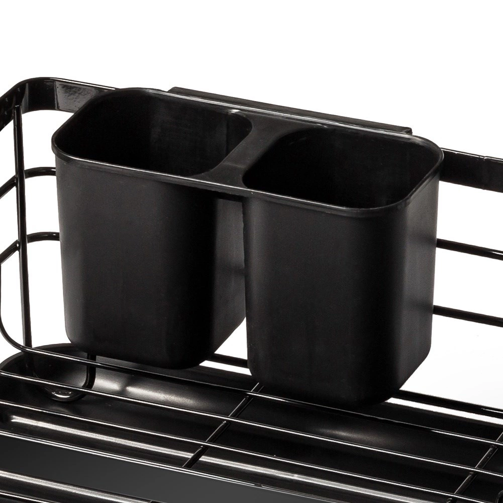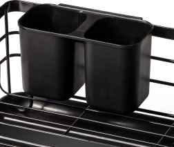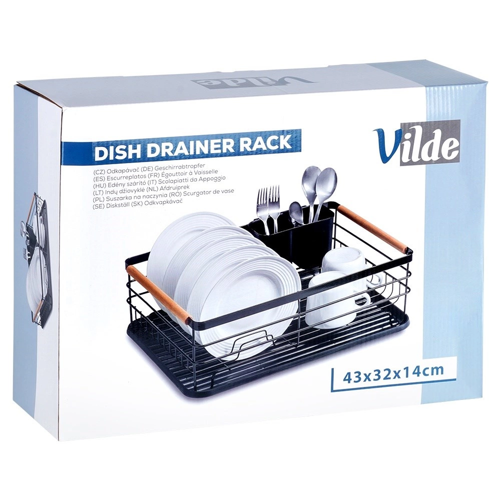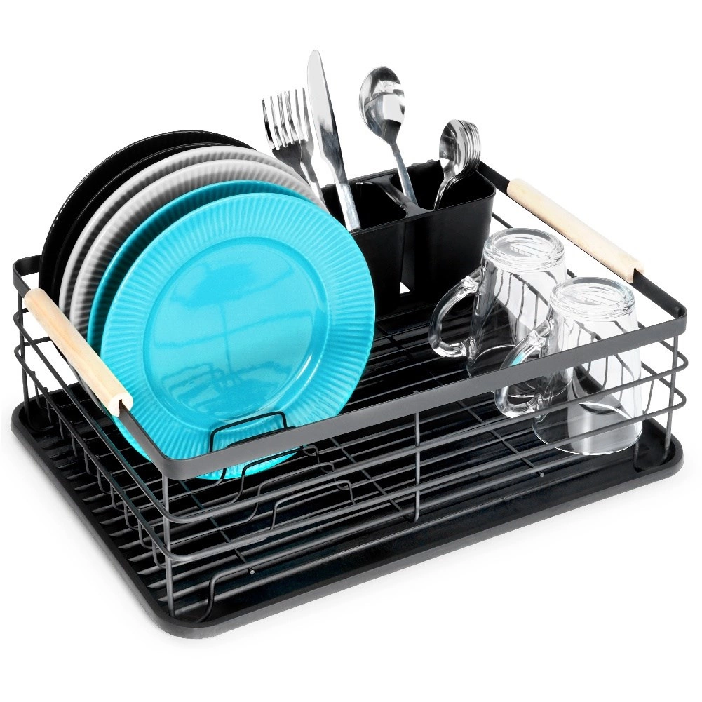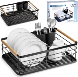 Et elegant og funktionelt opvaskestativ hjælper med at holde køkkenet rent og organiseret. Sort metaludførelse med naturlige bambushåndtag kombinerer holdbarhed med et moderne udtryk. Den aftagelige drypbakke opfanger vandet sikkert og gør rengøringen nemmere, mens den todelte bestikkurv kan placeres inde eller ude efter behov.
