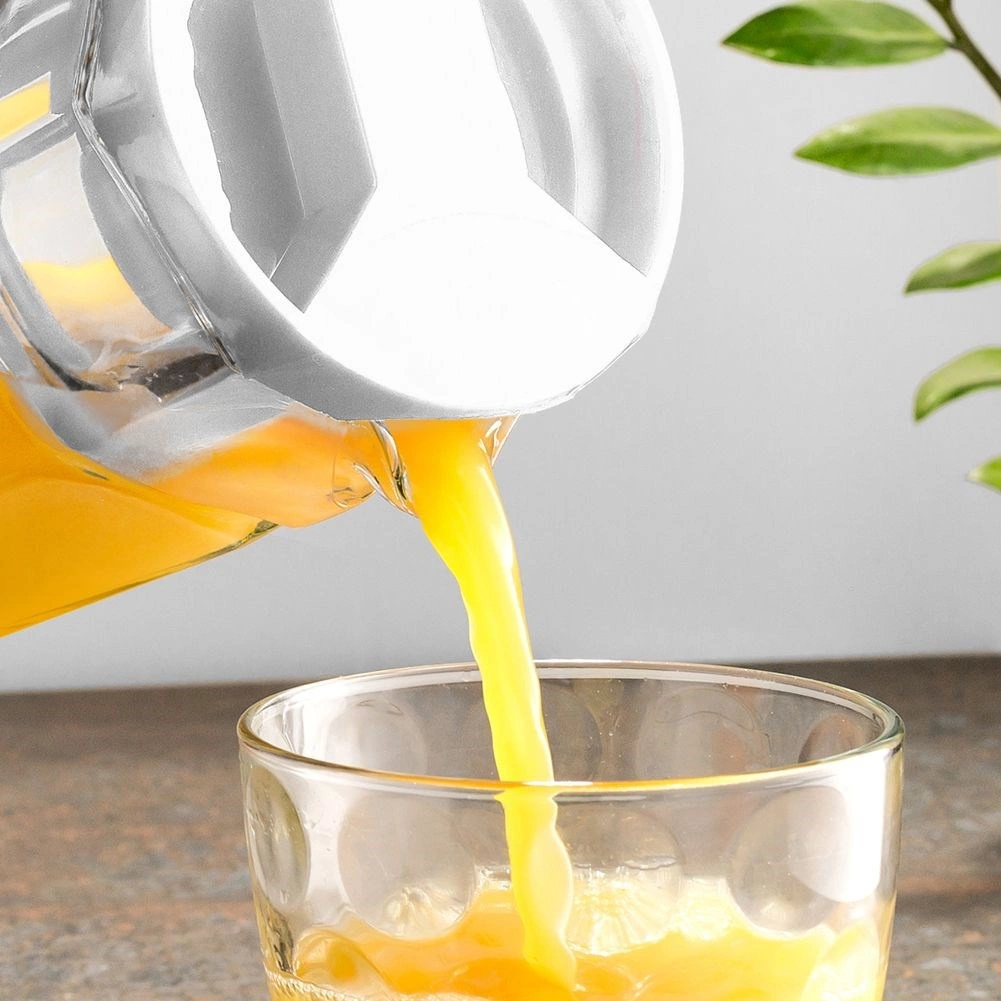Den formede tud og det solide håndtag sikrer præcis og jævn hældning. Ideel til juice, vand og lemonade – uden rod på bordet.