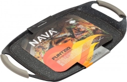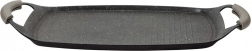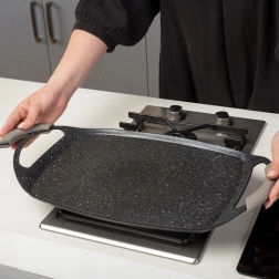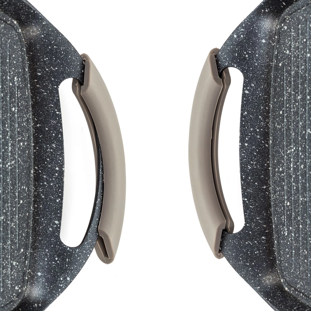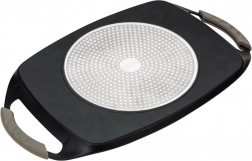 Med aftagelige silikoneovertræk på de integrerede håndtag for sikker håndtering. Pladen er kompatibel med gas-, el-, keramiske, halogen- og induktionskogeplader, kan bruges på grill og i ovn (uden silikoneovertræk) og tåler opvaskemaskine.