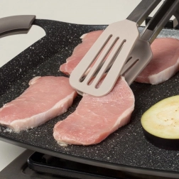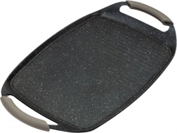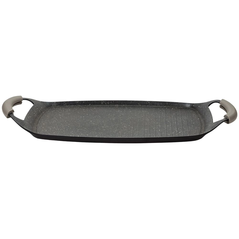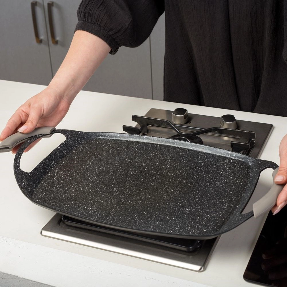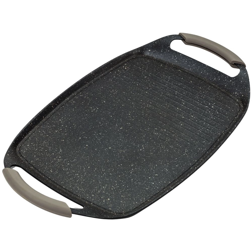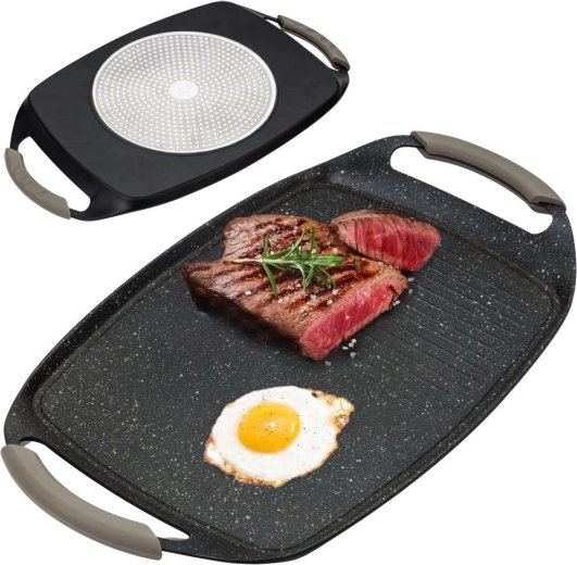 Vendbar plade med to zoner – en glat halvdel til pandekager, æg eller skaldyr og en riflet halvdel for markante grillstriber på kød og grøntsager. Det robuste aluminiumskorpus med femlags granit-belægning tåler høje temperaturer og pludselige temperaturskift og sikrer jævn gennemstegning uden at brænde på.