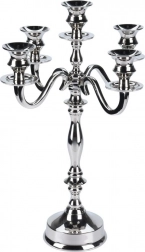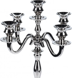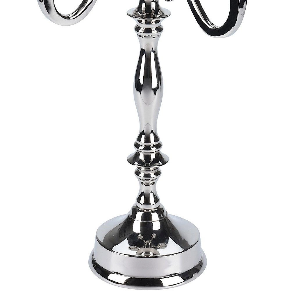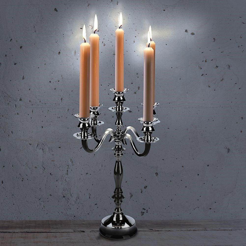Denne femarmede kandelaber i tidløst design er fremstillet af holdbart metal med en højt poleret sølvfarvet overflade. Den gør sig bemærket som midtpunkt på spisebordet, kommoden eller kaminhylden og forvandler hver aften til en stilfuld, romantisk atmosfære.