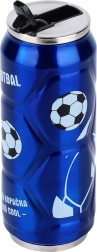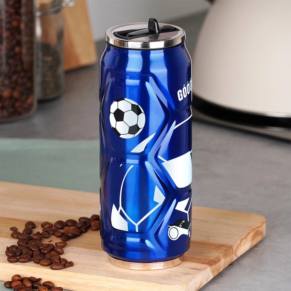 Nyd dine yndlingsdrikke i et moderne termokrus formet som en dåse med et iøjnefaldende fodboldmotiv på blå baggrund. Kvalitets rustfrit stål udvendigt og indvendigt sikrer holdbarhed og ren smag uden uønskede lugte. Vakuumisolation holder varme drikke varme i op til 12 timer og kolde drikke kolde i op til 8 timer – ideelt til rejser, kontoret og sport.