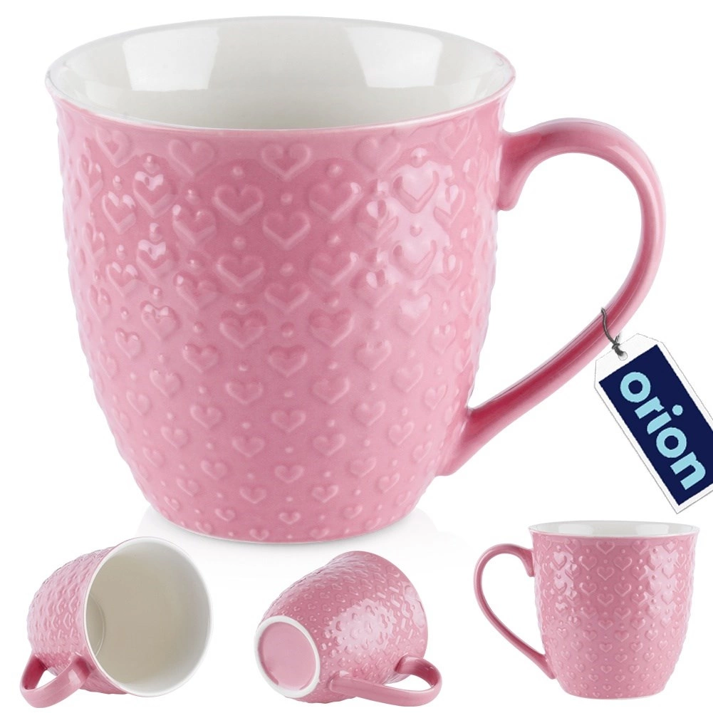 Stor lyserød kop med en kapacitet på 580 ml til kaffe- og teelskere. Den har en solid keramisk konstruktion, behageligt hank og reliéfdekoration med hjerter. Tåler opvaskemaskine og mikrobølgeovn, ideel til daglig brug og som en stilfuld gave.