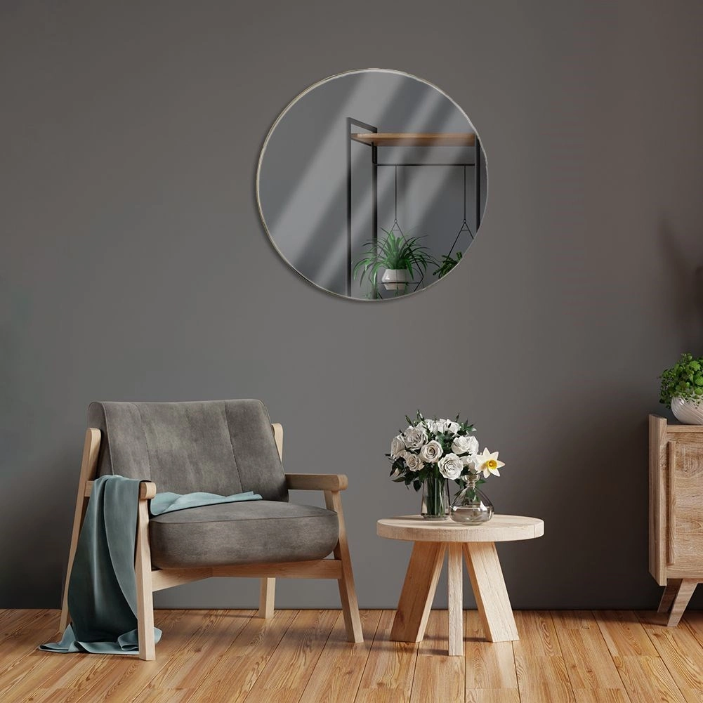 Det elegante vægspejl i moderne guldfinish er en universel dekoration til ethvert interiør. Med en diameter på 55 cm og en tynd ramme virker det let og luftigt, fremhæver rummets stil og er samtidig en praktisk hjælper i hverdagen.