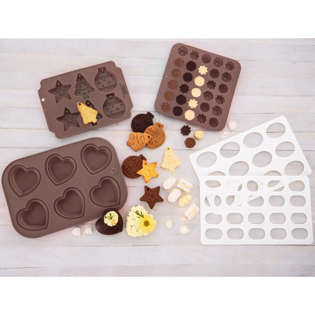 Denne brune silikoneform med julet tema er ideel til at bage småkager og honningkager eller lave chokolader og praliner. Seks fordybninger i tre populære former – stjerne, juletræ og julekugle – skaber effektfulde lækkerier med relief og hul til ophæng på juletræet. Fleksibel og non-stick silikone sikrer nem udtagning uden behov for at smøre.