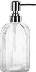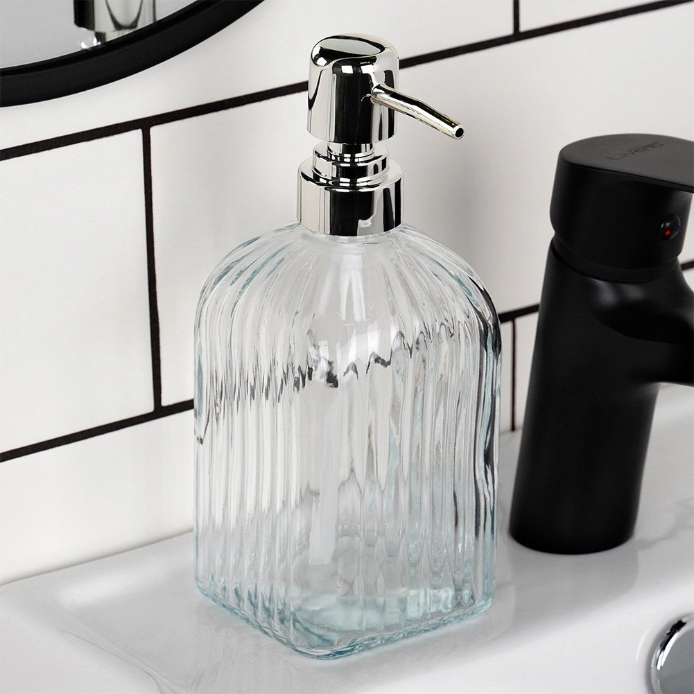 Praktisk og stilfuld dispenser til flydende sæbe eller opvaskemiddel af kvalitets- og dekorativt riflet glas. Den transparente krop giver øjeblikkelig kontrol over indholdet, mens den metalblanke pumpe sikrer bekvem og ren dosering. Perfekt til både badeværelse og køkken og hjælper med at holde orden omkring vask eller køkkenvask.