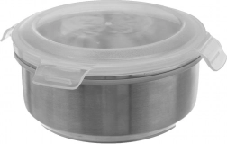 Denne runde beholder i rustfrit stål er en fremragende hjælper til opbevaring og transport af mad derhjemme, på arbejde og på rejser. Det transparente låg med fire solide clips og gummipakning sikrer pålidelig tæthed og længere friskhed. Skålen af kvalitetsrustfrit stål er holdbar, hygiejnisk og let at rengøre.