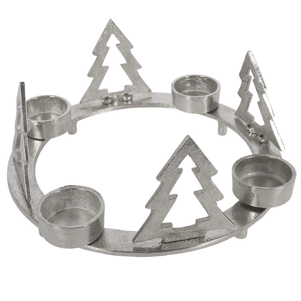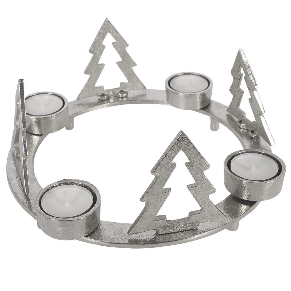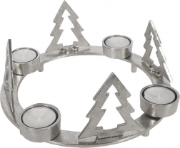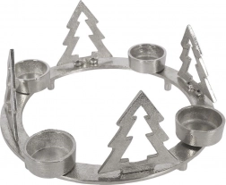 Denne runde fyrfadsstage er fremstillet af kvalitetsaluminium i sølvfinish og prydes af fire stiliserede silhuetter af juletræer. Takket være en diameter på 25 cm og den gennemtænkte placering af lysskålene skaber stagen et imponerende lysspil – ideel som adventsstage og som sæsondekoration.