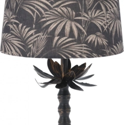 Denne stilfulde bordlampe forener klassisk elegance og moderne design. Den sorte tekstilskærm med gyldent bladmønster skaber en behagelig atmosfære og bliver et markant dekorativt element i stue, soveværelse, arbejdsværelse og kontor. Metalbasen med patineret udseende giver lampen en vintage karakter og en følelse af stabilitet.