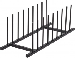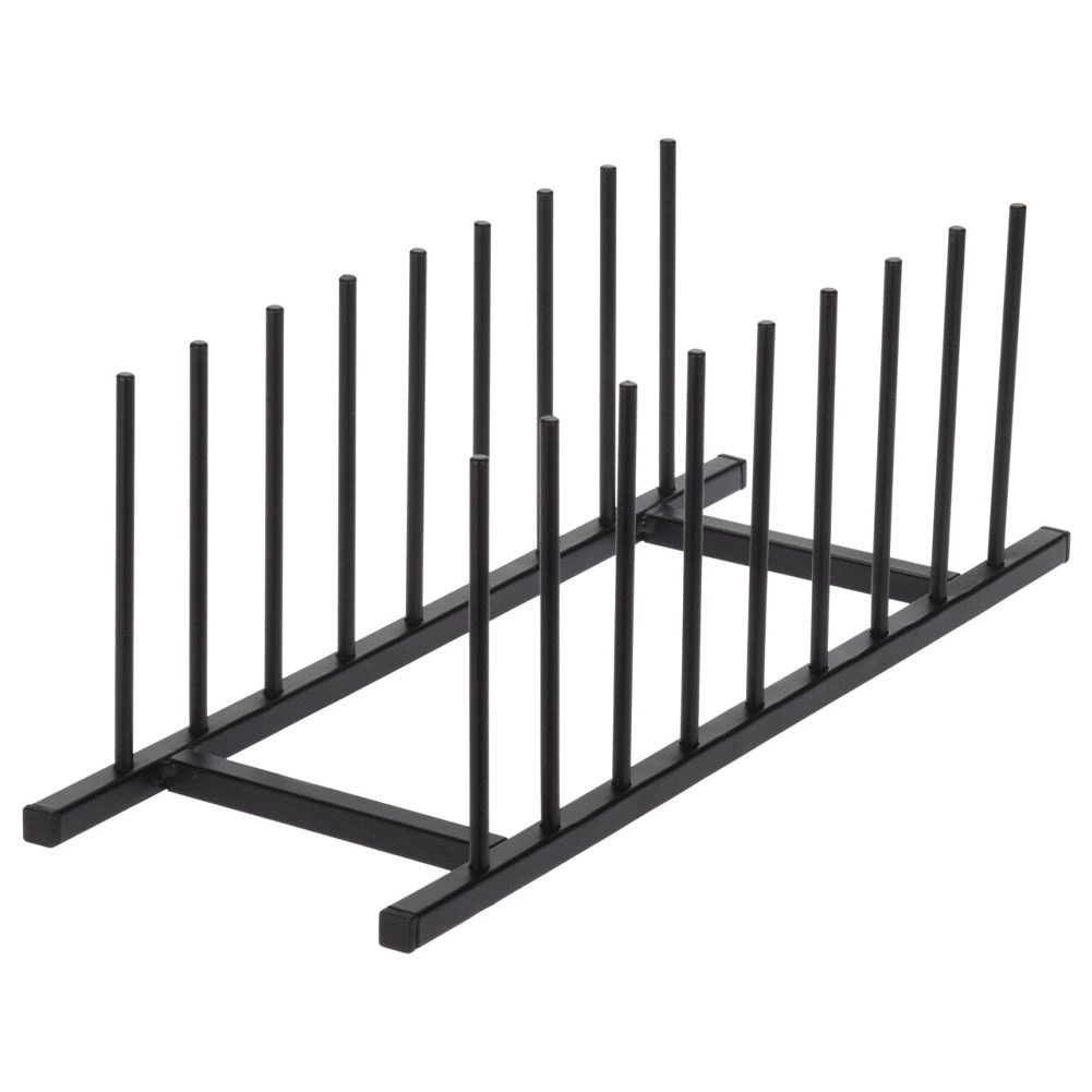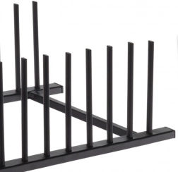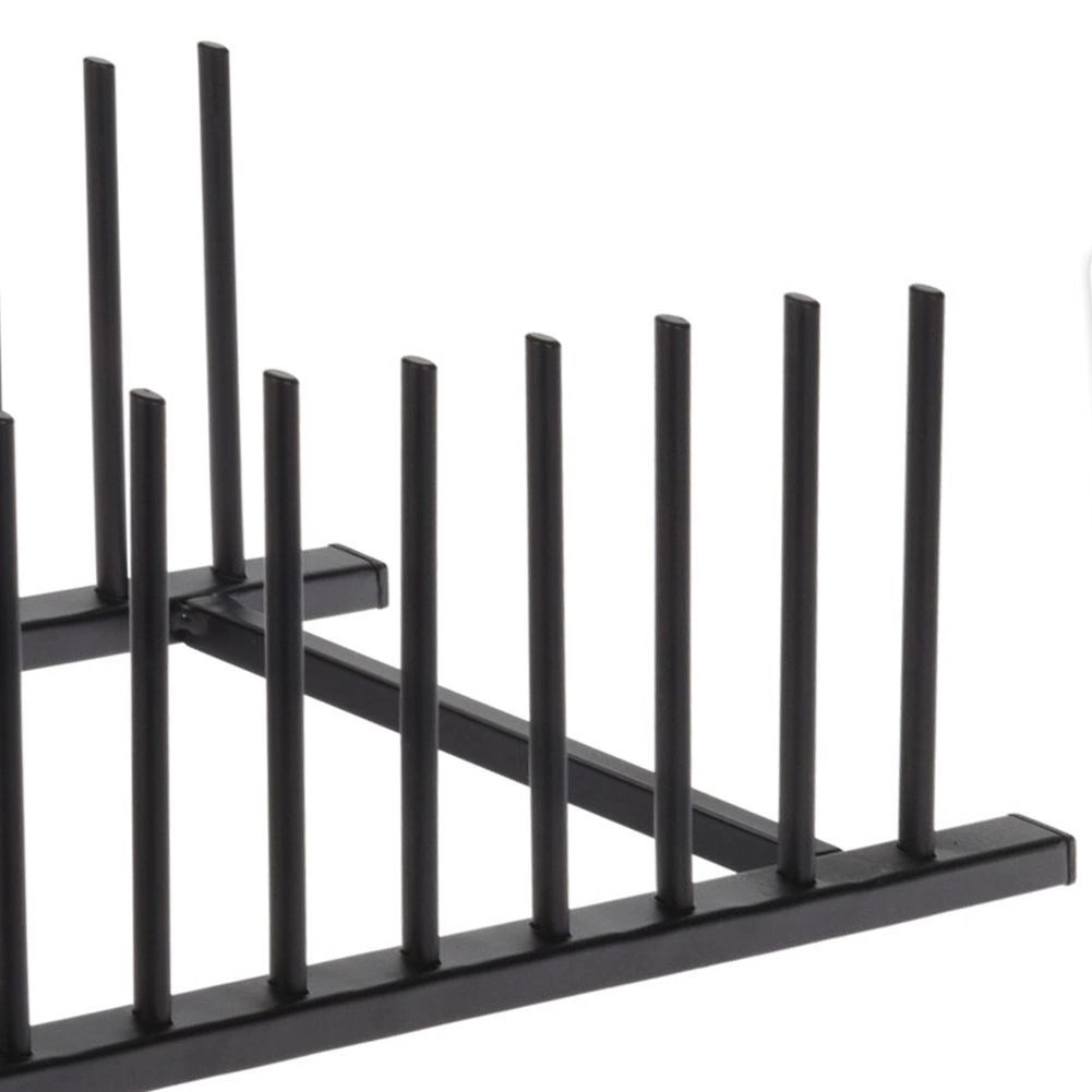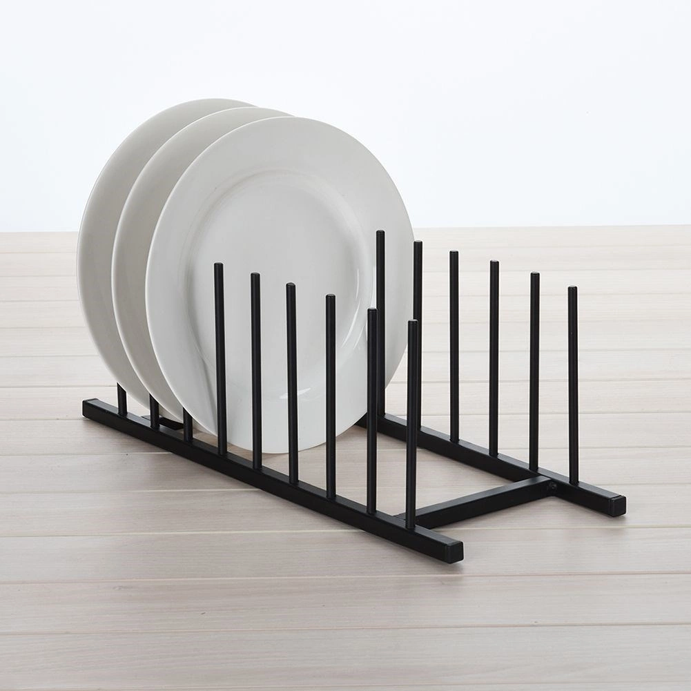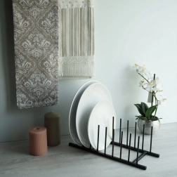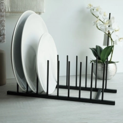 Praktisk køkkenorganizer til overskuelig opbevaring af op til 8 tallerkener eller låg i oprejst lodret position. Den robuste metalkonstruktion i sort passer til en moderne, industriel stil og hjælper med at spare plads i både skuffer og skabe, beskytter service mod ridser og gør tørring og organisering nemmere.
