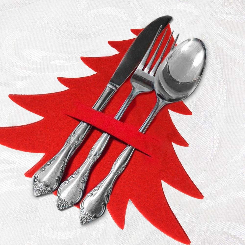 Sæt med 4 dekorative bestikposer formet som juletræer, fremstillet af fast rød filt. Takket være den horisontale udskæring opbevarer du ske, gaffel og kniv sikkert og overskueligt på ét sted. Et stilfuldt tilbehør, der straks understreger den festlige stemning ved enhver borddækning.