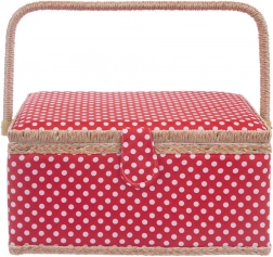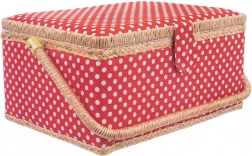 Rødt stof med hvide prikker og dekorativ fletning giver dit syarbejde flair, og kurven passer smukt ind i ethvert hobbyværksted derhjemme.