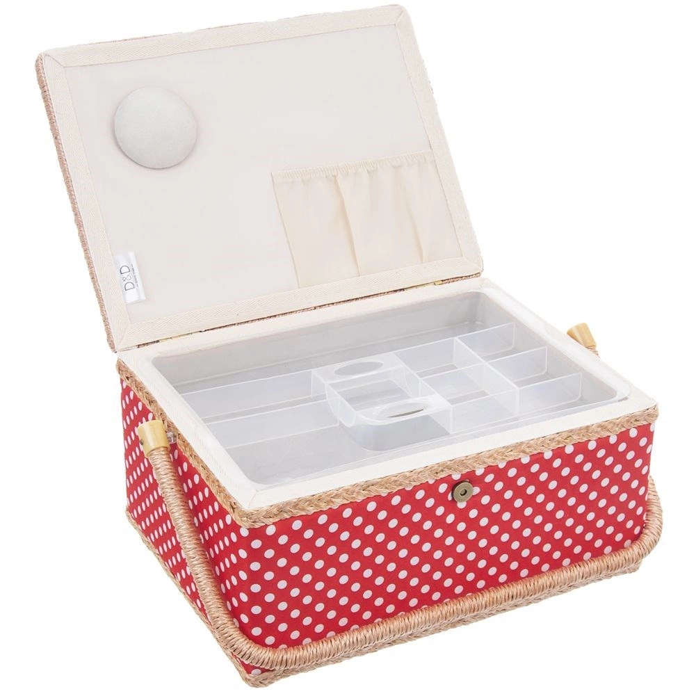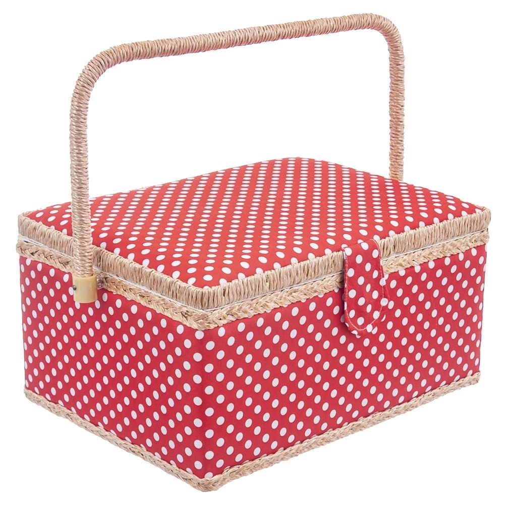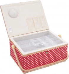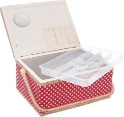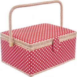 Denne sykurv kombinerer attraktivt design og gennemtænkt organisering. Kurvens krop er betrukket med rødt stof med hvide prikker og suppleret med et solidt håndtag for nem transport. Takket være magnetlukningen kan kurven lukkes sikkert med ét klik, og indholdet forbliver på plads under transport.
