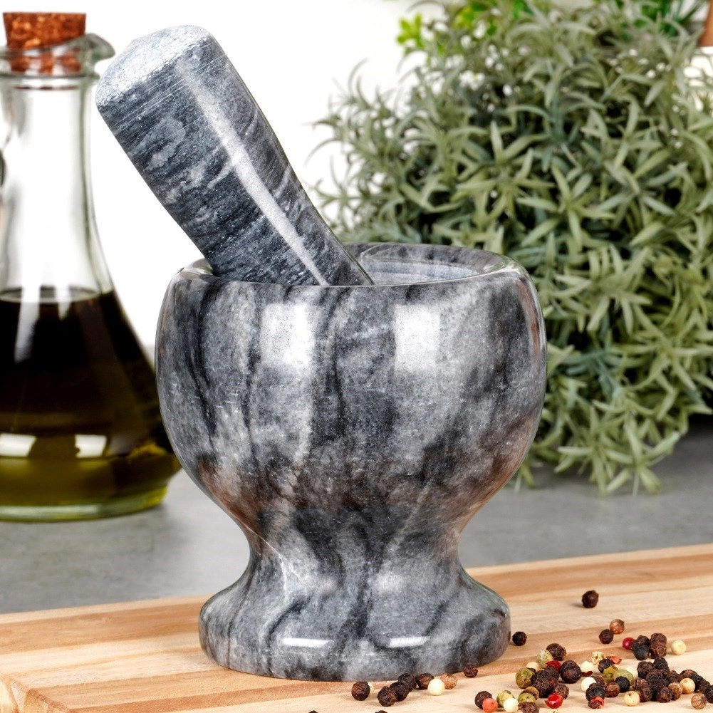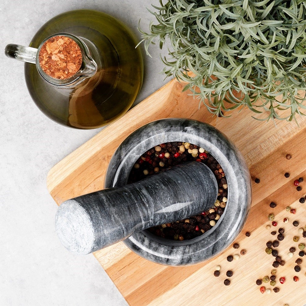 Oplev kraften i manuel maling med en granitmorter, der udmærker sig ved massiv konstruktion og lang levetid. Den upolerede inderside af skålen og støderens underside sikrer bedre greb og effektiv knusning selv af hårdere råvarer som peber, frø og nødder. Manuel maling hjælper med at frigive den fulde aroma – hjemmelavet karry, pesto eller urteblandinger bliver markant mere duftende og velsmagende.