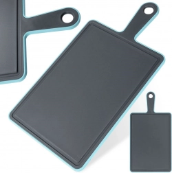 Praktisk skærebræt til daglig brug i køkkenet. Det har rektangulær form, skridsikker kant og et behageligt håndtag til bæring og ophæng. Den smarte afløbsrille opfanger safter fra råvarerne, så bordpladen forbliver ren.