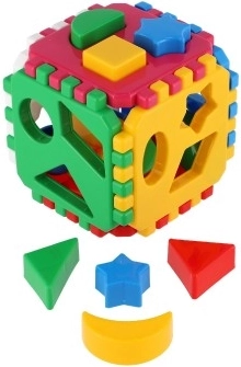 Pakken indeholder dele til at samle kuben samt et sæt former, der kan skubbes gennem de tilsvarende huller. Det holdbare plastmateriale og de kompakte mål 12 × 12 × 12 cm gør den til legetøj, der er perfekt både hjemme og på farten.