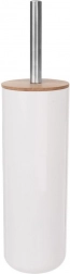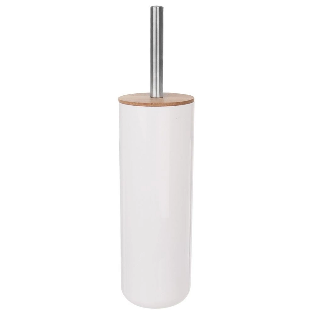 Den minimalistiske hvide stander med naturligt bambuslåg skjuler børsten elegant og holder dit badeværelse visuelt ryddeligt.