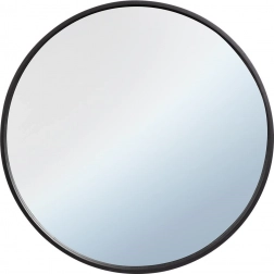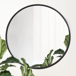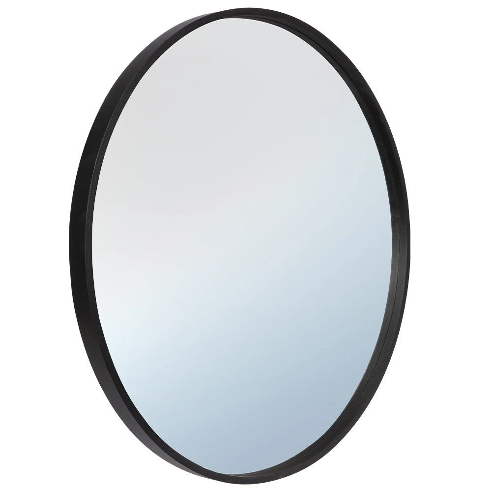 Den runde form og den slanke sorte ramme skaber en moderne accent, der visuelt forstørrer og lysner rummet.